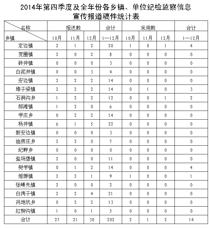 附:1、2014第四季度及全年各乡镇纪检监察信息宣传报道稿件统计表