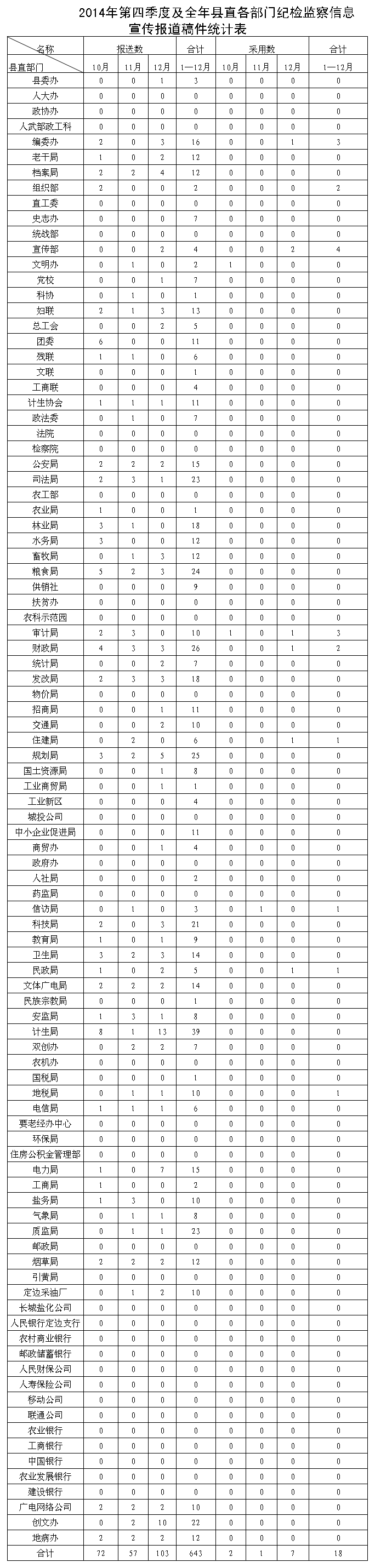2、2014第四季度及全年县直各部门纪检监察信息宣传报道稿件统计表