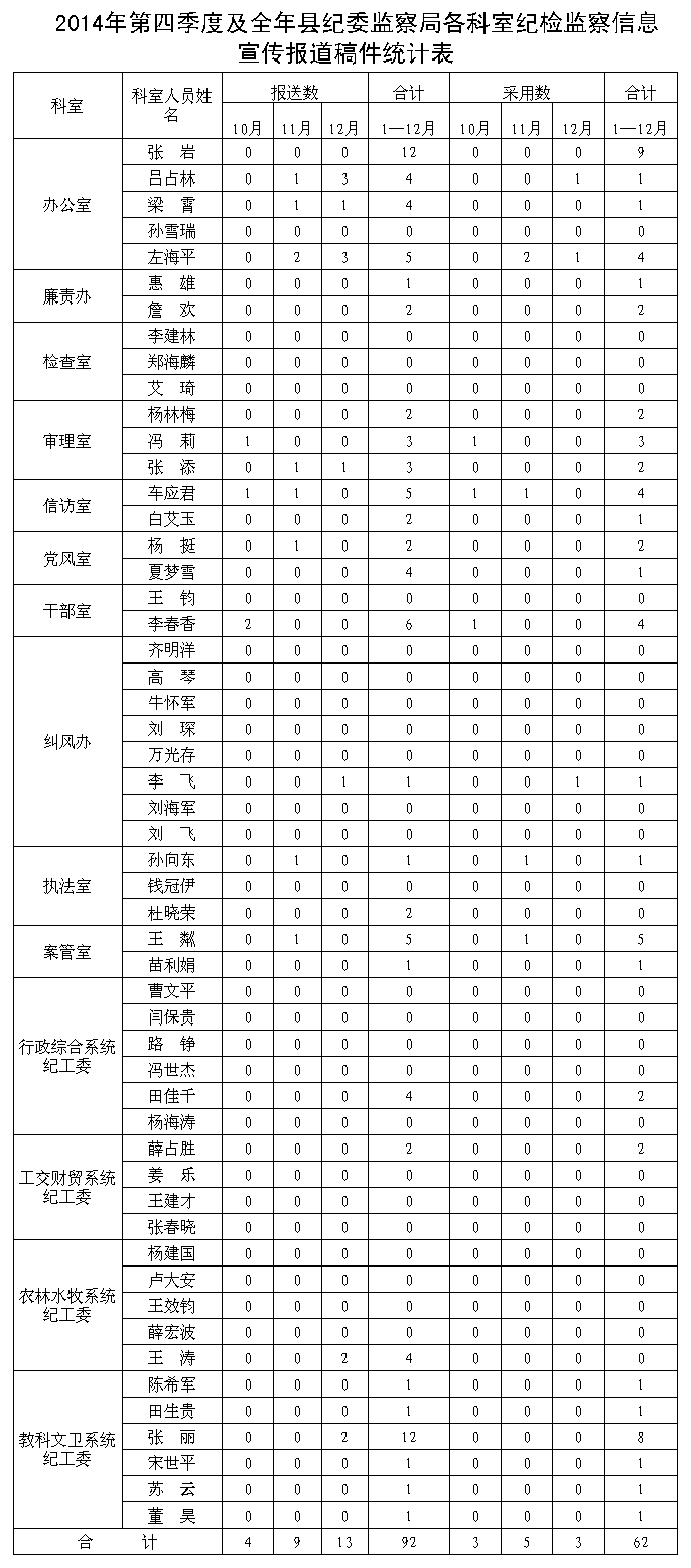 3、2014第四季度及全年县纪委监察局各科室纪检监察信息宣传报道稿件统计表